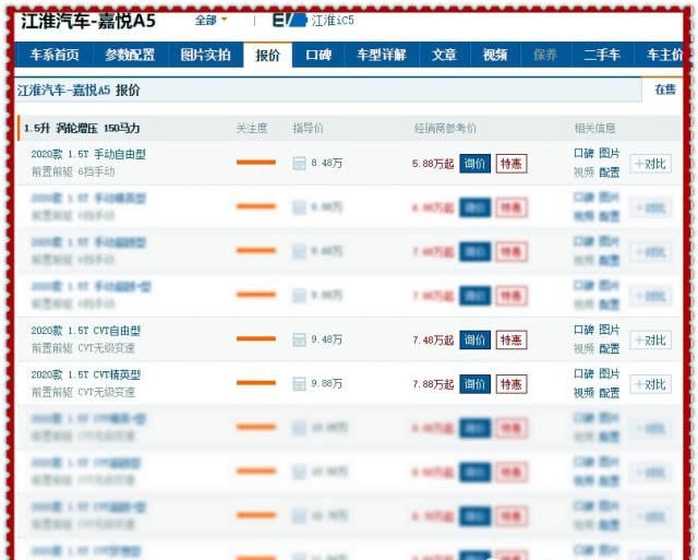 JAC的佳悦A5一上市就成了纯红色产品当我看到佳悦A5时,很难相信这是一辆江淮轿车,也很难相信这是一辆价格只有84800元的甲级轿车。佳悦A5是JAC和JAC大众生产的第一辆“设备相同、人员相同、标准相同”的汽车。采用德国VDA管理质量体系底盘和生产技术都很方便,严格按照大众的标准,使这款全新的汽车有信心与同行竞争。
