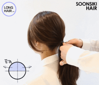 步骤3:从马尾辫下方将留在发圈周围的头发包起来,最后用夹子固定,或者将发尾插入发圈并扎紧。