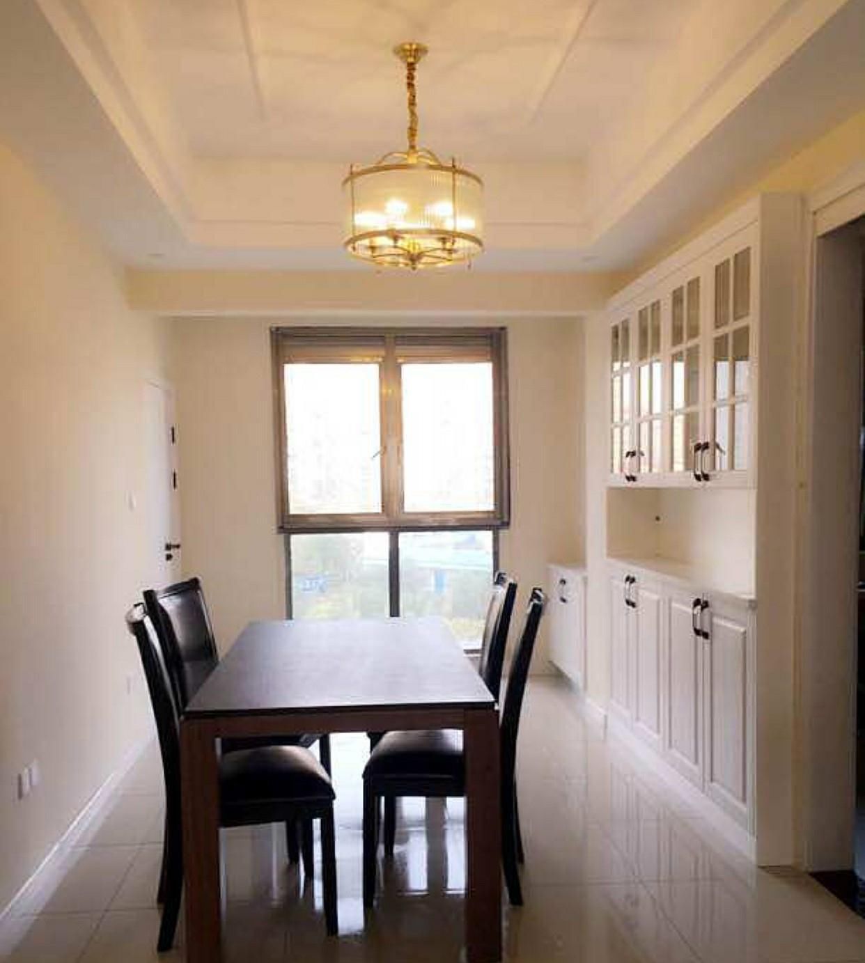 餐厅的宽度相对较窄,布置了实木方形餐桌,正好占据了合适的空间。如果你在搬到新家后需要搬家,那会方便得多。吊灯的黄铜风格非常轻盈时尚。