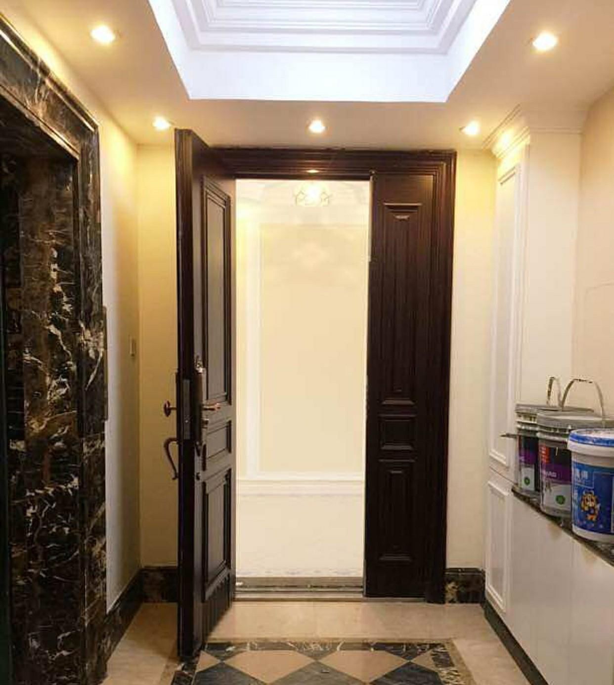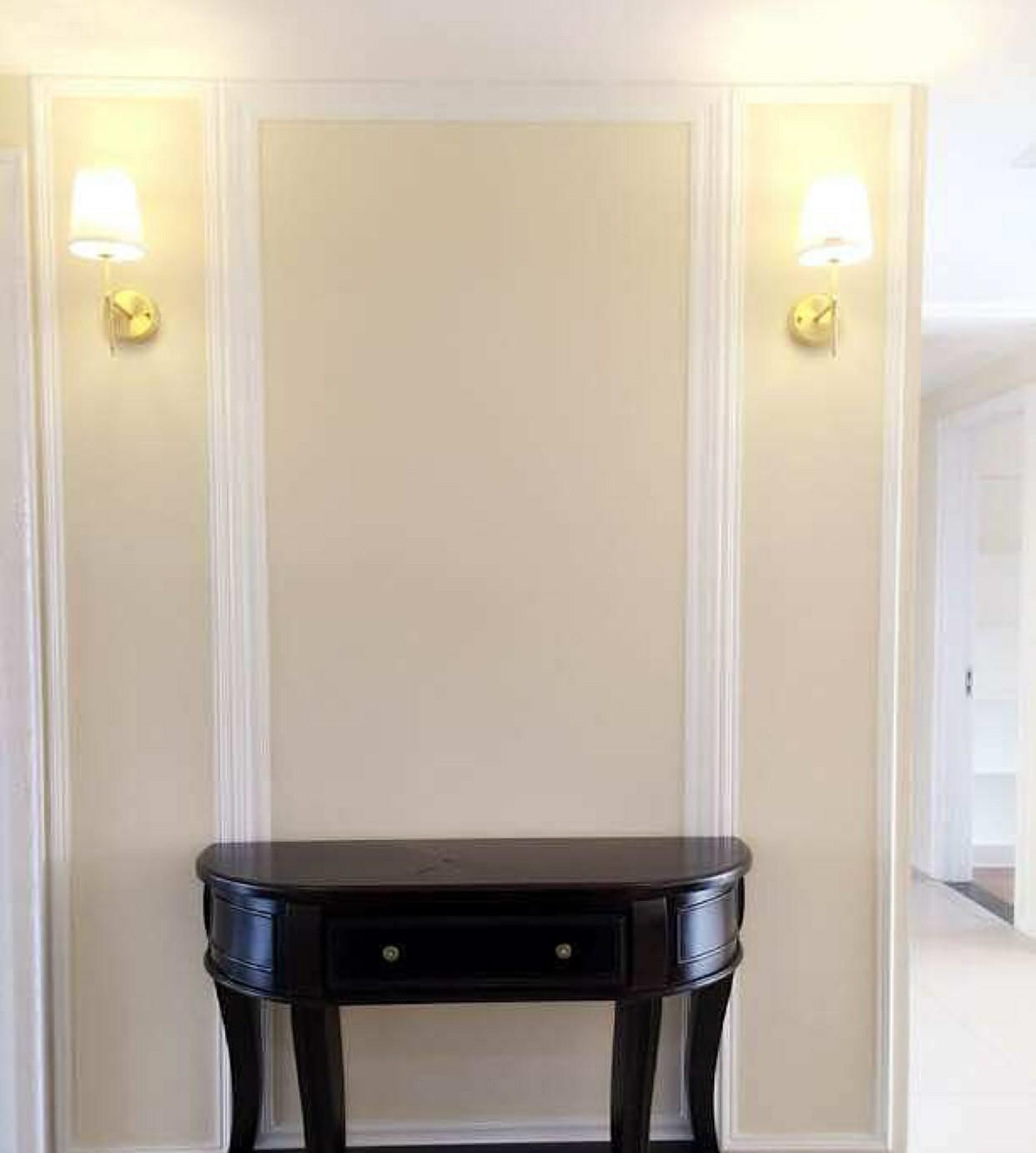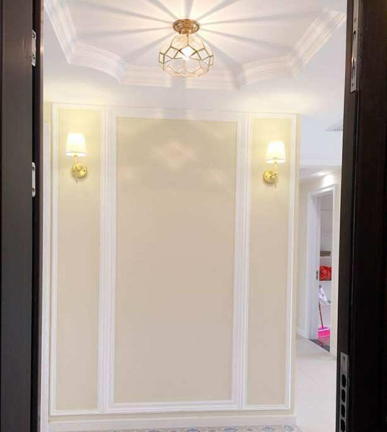在这个角度开门。石膏线贴在门廊的背景墙上,装饰简单美观。房子的主人用现代简单的美国风格装饰,墙面用相对温暖的黄色乳胶漆粉刷。为了增加夜间照明和二次照明,安装了壁灯,在视觉上看起来非常大气。