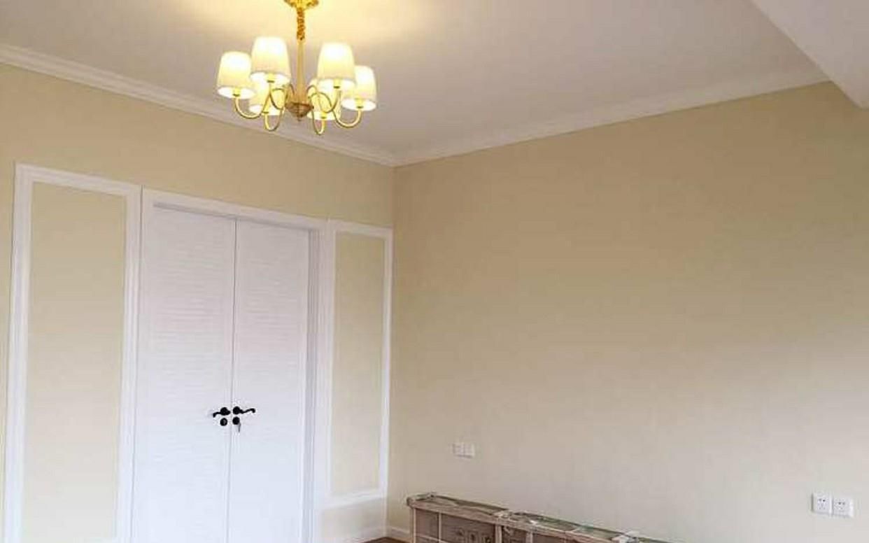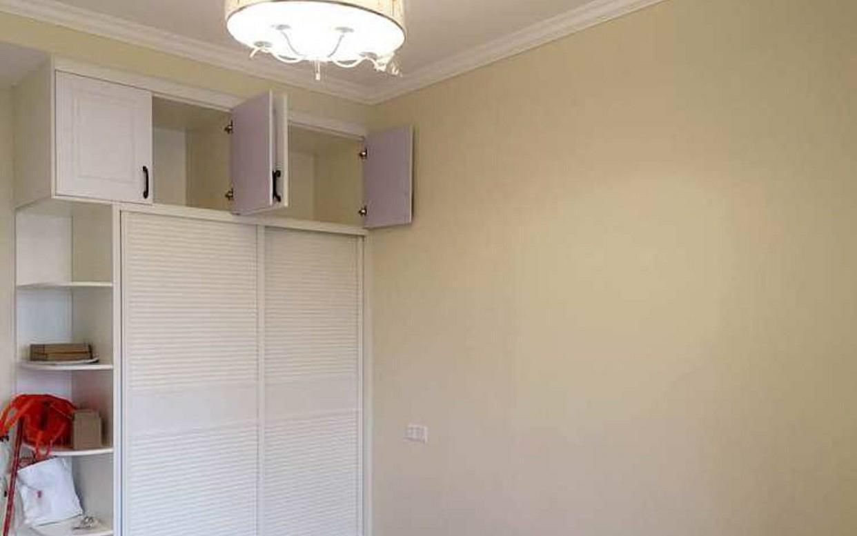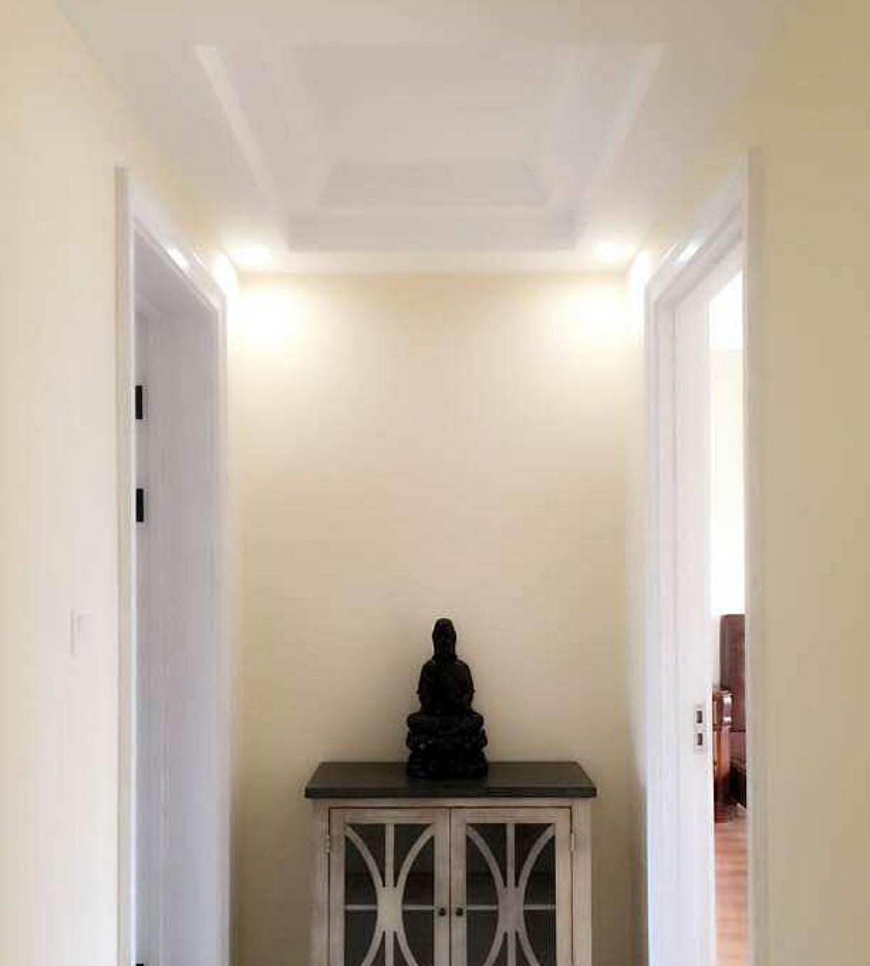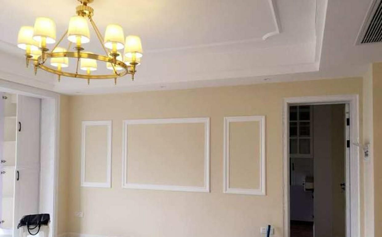 顶部装有中央空调。这是房主的第二栋新房子。她放弃了照明带,安装了一个相对方便实用的中央空调。顶部表面也涂有一圈石膏线,给人一种更有层次感的感觉。