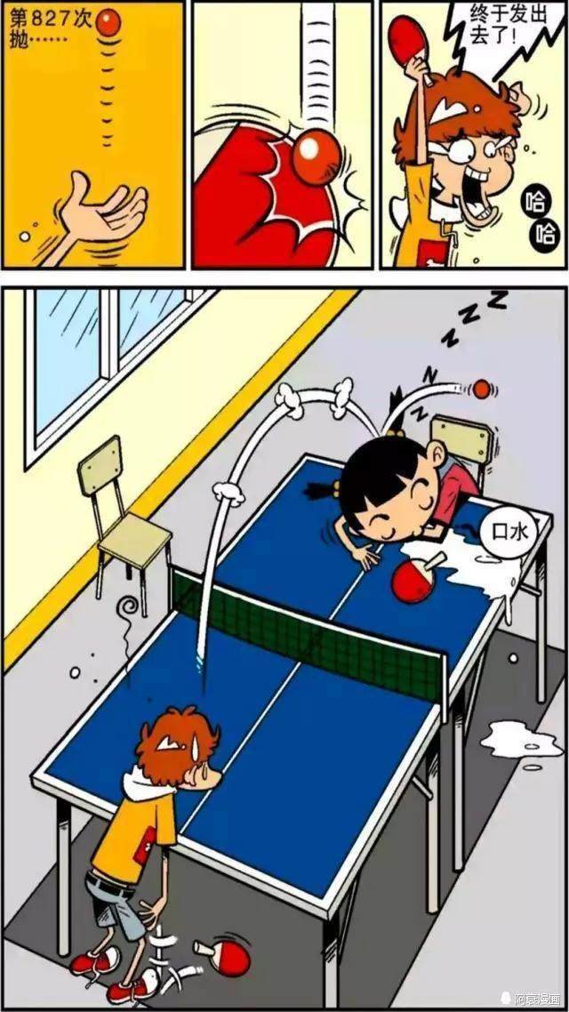 :但是球越过网后,打在了大脸妹妹的头上,没有反应。原来大脸妹妹已经在球桌上睡着了...旁白