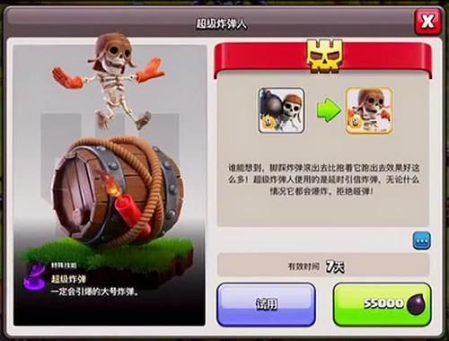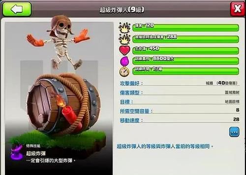 与此同时,超级轰炸机的生命值和攻击力也有了很大的提高,对墙壁的伤害提高了40倍,直接把它变成了比超级巨人更好的“拆墙小专家”。不过,其训练费用也提到了8800圣水点,所需空间增加到了8点,但移动速度也比以前快了4点,整体上还是很强的。