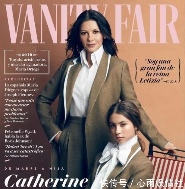 她身着卡其色套装,高领白衬衫,帅气十足,增添了贵族气息。凯瑟琳优雅的气质堪比皇家女王。女儿卡丽丝还年轻,不如她母亲穿同样衣服的能力。她的一些孩子的衣服是从成人那里偷来的。里面的蝴蝶结衬衫更甜美,英国的学术氛围也很赏心悦目。杂志的造型师发给母亲和女儿的衣服确实有偏见。