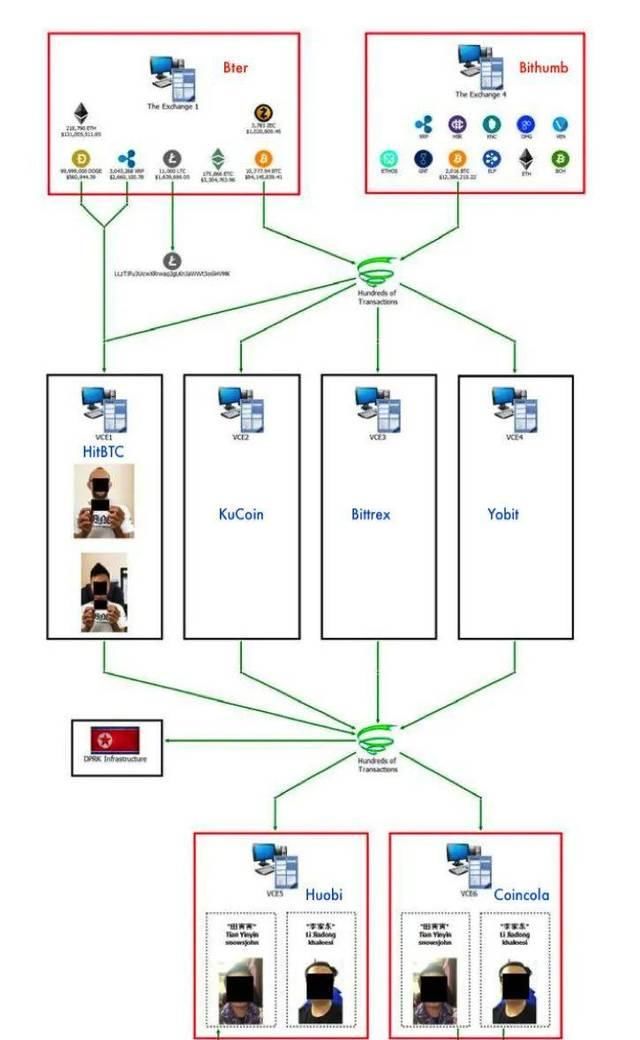如上图所示,事件最初被视为:朝鲜黑客组织拉扎勒斯集团通过钓鱼等手段攻击四家数字资产交易所获取交易所的私钥;后来,黑客使用剥离链和其他方法将被盗资产转移到另外四家交易所,即VCE1至VCE4。然后黑客利用剥离链将资产转移到两个负责洗钱的负责人的账户VCE5和VCE6,最后将它们变成法定货币完成整个过程美国司法部起诉负责洗钱的田·和是最后一批人。