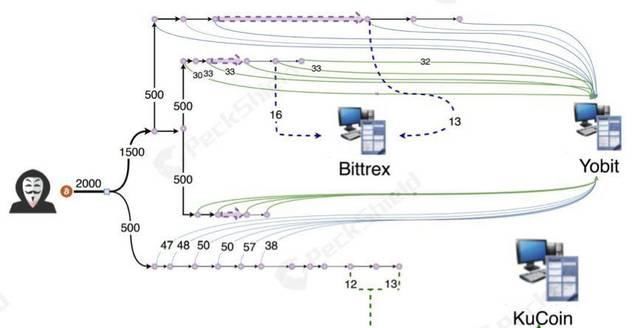 4。对新地址重复步骤3,直到所有原始的500 BTC存入交换机。在此过程中,攻击者还将记录重新充值到其他交易所,如Bittrex、KuCoin和HitBTC。在