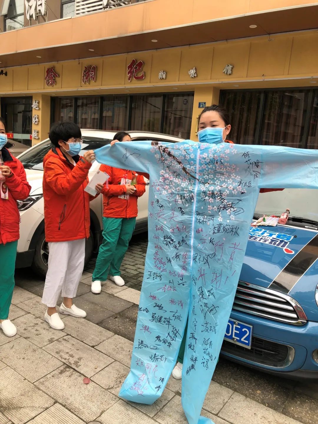 事实上,佛山医疗队23日离开武汉来送我的爱歌志愿者领队雷春丽说,他们担心与正式的送别活动发生冲突,特意提前一天送了礼物。独具武汉特色的樱花防护服是雷李春的作品。