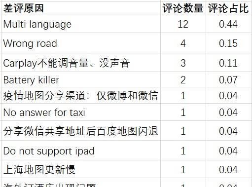 经过统计,不良评论分别占前三个原因:不支持多国语言、对英语母语用户不友好、道路导航信息不准确以及车载功能的大量使用问题评估不佳的其他原因包括高能耗、对出租车呼叫无反应以及酒店预订方面的问题。