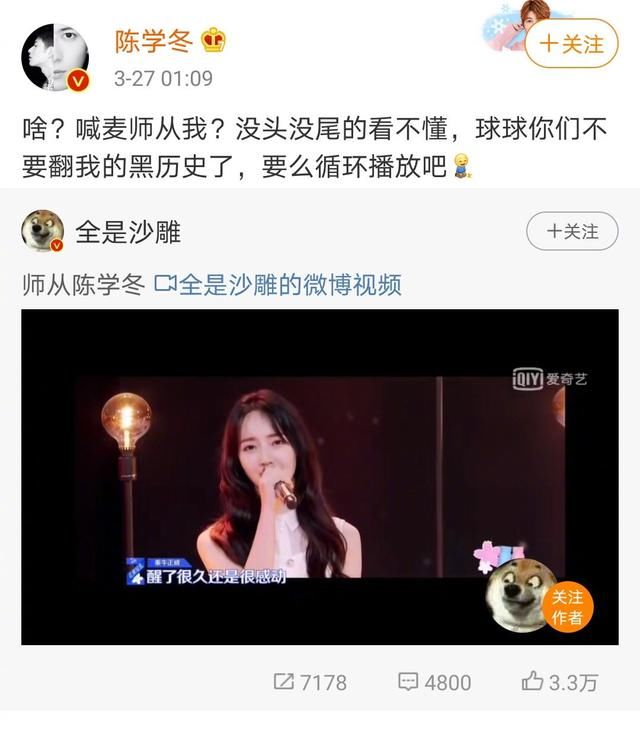 但是他已经很久没有唱歌了陈没想到这件事会被网民们再次翻案,于是出现了转发求饶的趋势。然而,他没有想到的是,制作视频的网民并不想嘲笑他,而是想批评钦纽·郑伟,因为在视频的后半部分,钦纽·郑伟在流行综艺节目《青春与你2》中的说唱过程出现了。网友们制作了这段视频,抱怨和陈一样,歌唱得不好。