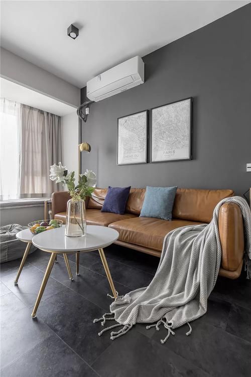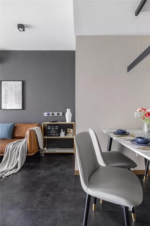 ▲客餐厅的地板采用深灰色地砖,营造低调而有质感的空间氛围在
