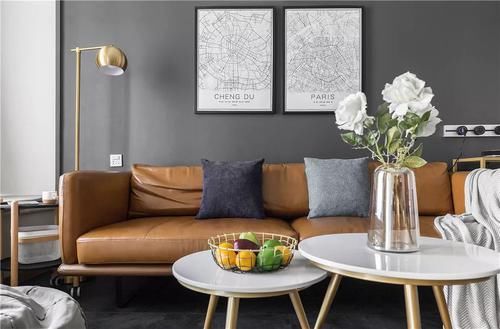 ▲灰色沙发背景墙饰有两幅黑白地图线条艺术画,提升空间风格