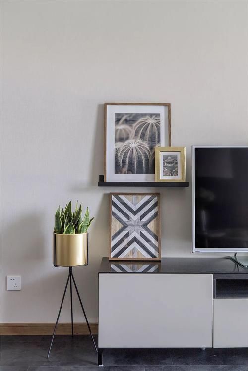 ▲简单整洁的背景墙+电视柜,绿色植物错落有致,组合挂画,风格层次分明。