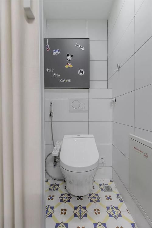 ▲卫生间区域地面铺有蓝色和黄色图案的小型复古瓷砖。整个是新鲜和干净的。