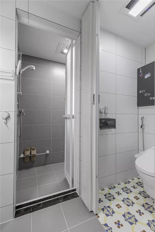 ▲卫生间采用三种分隔形式,卫生间、盥洗室和淋浴室分别位于不同区域,多用户互不干扰。