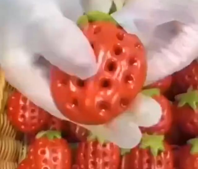 红色草莓和绿色草莓,它们几乎和真正的草莓一样,没有任何颜色线,有时这些水果有一个“三明治”,里面有一个小的。