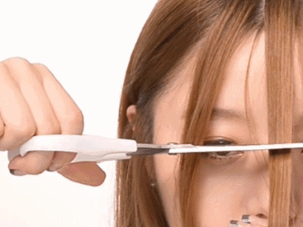 步骤4:将中间一束头发拉到鼻子处,根据眉毛和眼睛的位置剪下合适的长度小心不要一下子切得太多,慢慢来。