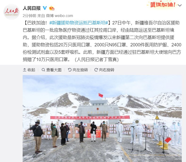 1999年1月27日中午,一批新疆维吾尔自治区援助巴基斯坦的急救医疗物资通过红旗浦港由陆路运往巴基斯坦据报道,这是新疆自新的冠状肺炎疫情爆发以来第二次向巴基斯坦提供援助。援助包括200,000个医用口罩、2,000个N95口罩、2,000件医用防护服、2,400个测试包和5套呼吸器此前,新疆通过其驻巴基斯坦大使馆向巴基斯坦捐赠了10万个医用口罩。(人民日报记者丁)