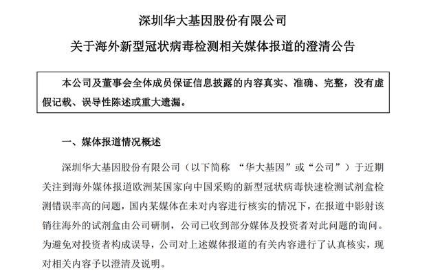 1。媒体报道概述深圳华大基因有限公司(以下简称“华大基因”或“公司”)最近一直关注欧洲国家从中国购买的新型冠状病毒快速检测试剂盒的高检测错误率。在没有核实内容的情况下,一家国内媒体在其报道中暗示,销往海外的工具包是该公司开发的。该公司已经收到了一些媒体和投资者关于这个问题的询问。为避免误导投资者,本公司已仔细核实上述媒体报道的相关内容,现将相关内容予以澄清和说明。