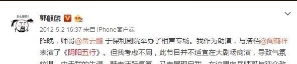 2年,011年,郭麒麟一名15岁的初中生辍学,正式向德云社的于谦学习相声。2012年5月,他是一个特别相声表演的助理演员,由他的老师岳兄弟表演。