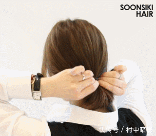 步骤2:同样,用左手按住橡皮筋,用右手轻轻拉起后脑勺的头发,然后拉上面的两根