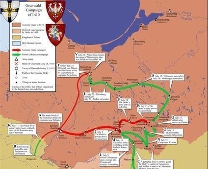 1410年6月24日,捷克雇佣军和所有波兰联盟和武装部队在波兰东部150公里处的Cserven Czerwinsk村集合。随后,在亚加瓦的指挥下,波兰-利比里亚联盟通过浮桥迅速渡过维斯瓦河。维塔塔斯指挥下的立陶宛军队早在6月3日就从维尔纽斯出发了。他们到达Cserven Tzik的同一天,主要的联合部队过河。到6月30日,仅用了一周的时间,宝丽莱联军就完成了这一多民族部队之间的精确协调机动部署。联军过河后,西莫威特四世、马索维亚公爵和华沙的马努斯也加入了联军。