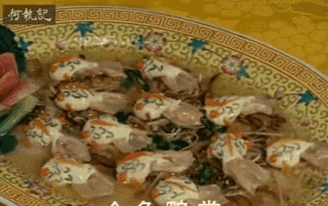 是最独特的“百花齐放争妍”的鸭子。它是由炸鸭片、蟹黄、鹅肾、虾胶和鱿鱼制成的。鸭肉和干鲜花海鲜琳琅满目。