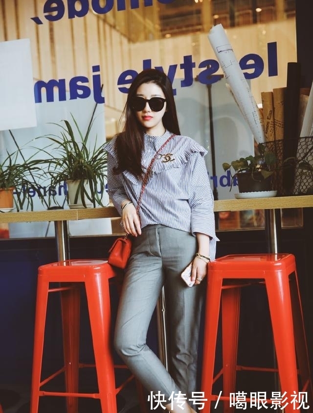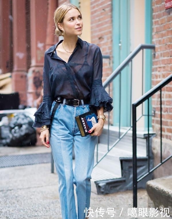 说到盖肉的功能,荷叶领应该起带头作用。在这一季的街头摄影中,荷叶领子的镜面出现率极高。荷叶领衬衫搭配超短裙甜美优雅,裤子自然迷人。
