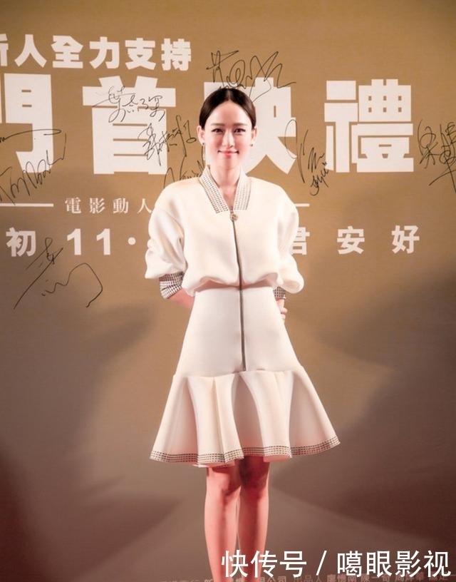 陈乔恩穿着白色外套+荷叶裙超短裙套装,搭配金属尖头鞋,清新亮丽,令人心动。
