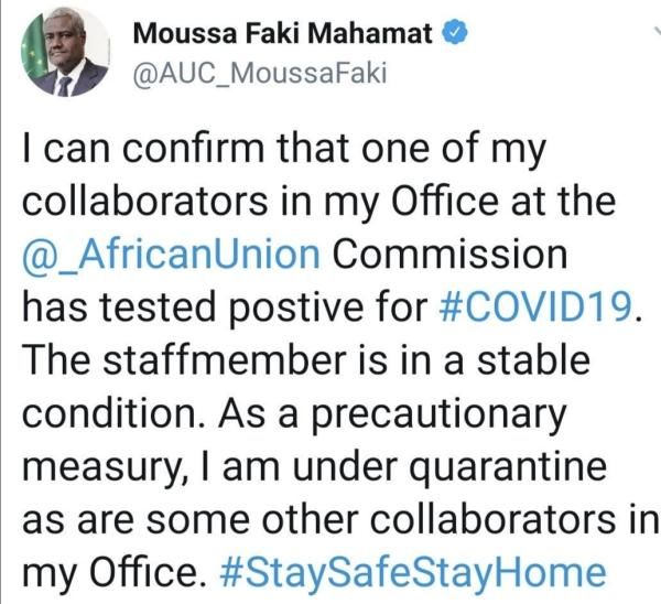 199非盟总部确诊一例新的冠状肺炎病例,非盟委员会主席法基在社交媒体上宣布,非盟总部主席办公室一名工作人员确诊为新的冠状肺炎阳性,目前情况稳定。目前,他已经把自己和家里办公室的其他人隔离开来。
