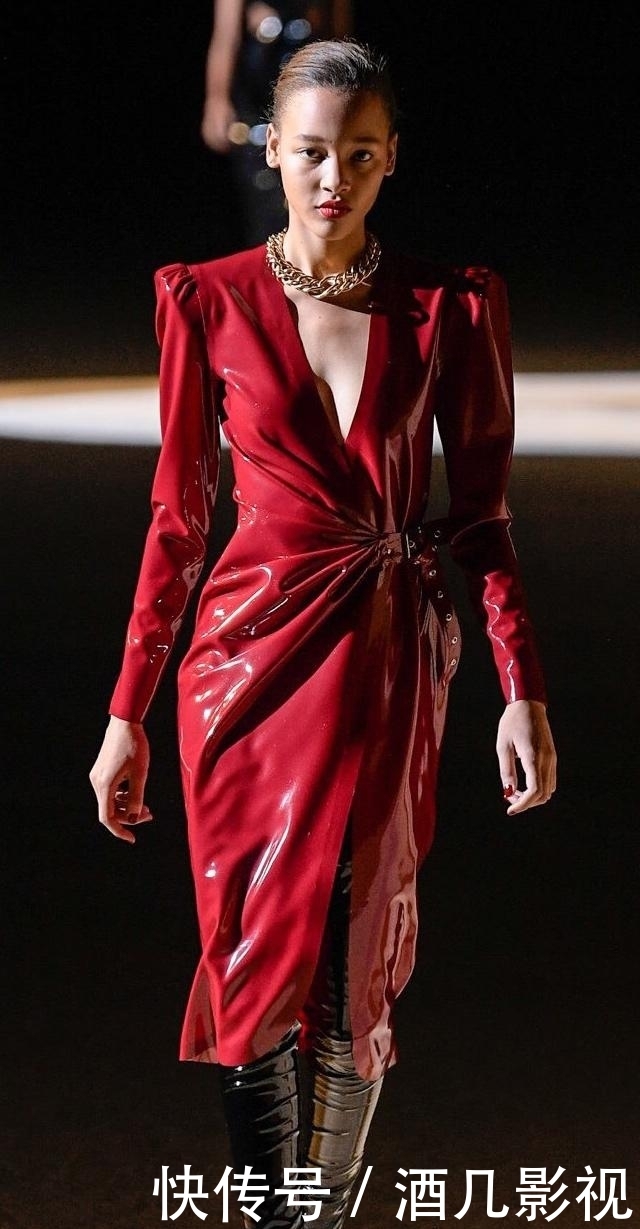 大型塑料服装对于很多人来说是很难控制的,必须有很强的气场,这款红色漆皮连衣裙,中性垫肩和同材质的靴子展现了当代女性的强烈个性深V领设计也中和了强烈的气质,有点性感。整体设计恰到好处。