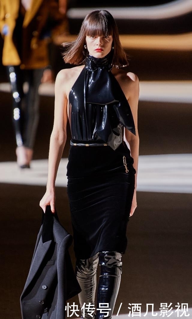 这件外套也是圣洛朗2020秋冬系列。挂颈设计,加上更多引人注目的元素,展现了女性的魅力。黑色天鹅绒超短裙和塑料靴子既酷又性感,给人以强烈的视觉冲击,用现代的方式再现了20世纪90年代圣洛朗现代女孩的形象。