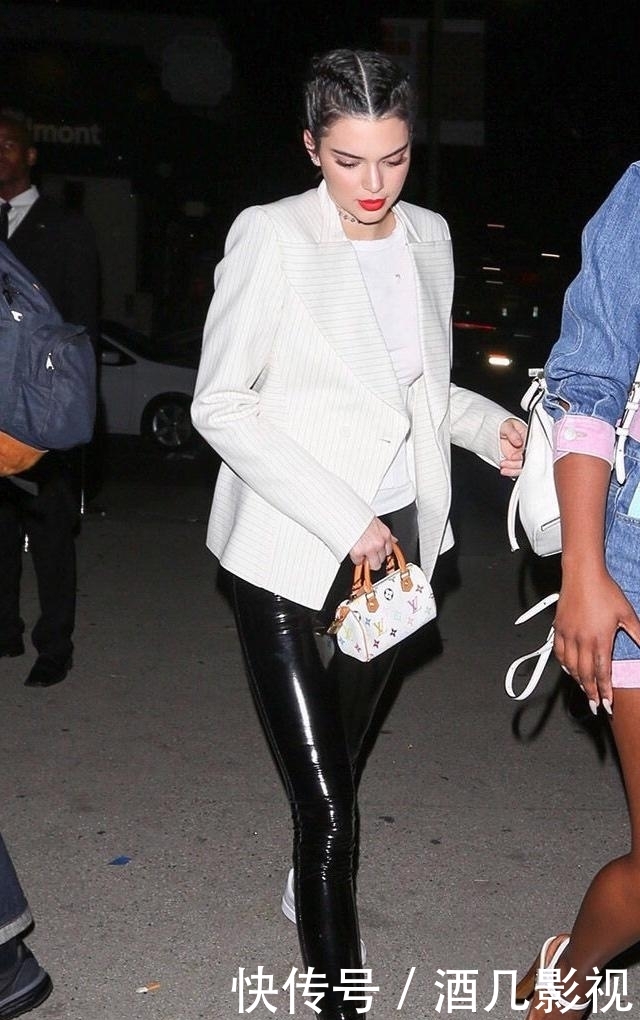 肯德尔·詹纳在洛杉矶外出时,穿着白色翻领条纹西装,搭配漆皮塑料裤和白色小鞋。他英俊潇洒,不经意间显露出他干练的气质。紧身裤可以显示更多的腿部线条,看起来越来越苗条。迷你LV包也是抢眼的笔,颜色系统与服装相对应。