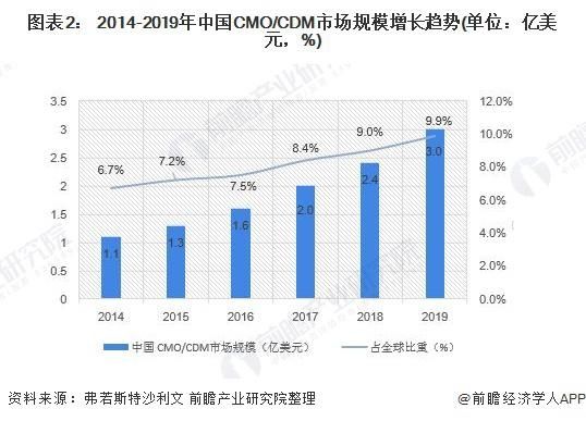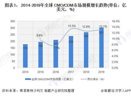 年和2019年达到303亿美元。在全球处方药市场稳定增长、新药研发难度加大、仿制药竞争日益激烈的背景下,制药公司越来越愿意控制成本和风险。通过产业链分工将R&D生产和销售外包给具有比较优势的外包公司将成为未来企业控制成本和分散风险的主要方式之一。数据显示,2019年全球CMO/清洁发展机制市场为303亿美元,2014-2019年复合增长率为10.7%