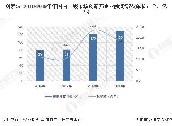 近年来,我国在创新药物领域出台了一系列配套政策,如化学药品注册分类改革、上市许可证持有者制度试点、创新药物优先评价、专利补偿、药物试验数据保护等。这些政策打破了新药开发的政策壁垒,加快了新药开发的速度。创新药物和创新技术已经成为追求工业资本的热点。以微核心生物、百济神州、信达生物为代表的近十家地方创新药物研发公司先后宣布了一批巨额融资,为新药研发提供了重要的资金支持。2019年,国内一级市场创新型药品企业融资事件130起,融资金额184亿元。