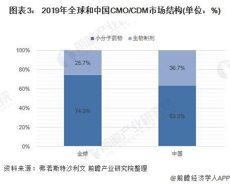 %。从CMO/CDMO市场结构来看,小分子制药占大多数。2019年,小分子制药CMO/CDMO的全球市场规模为225亿美元,占全球CMO/CDMO市场的74.3%。中国的小分子药物CMO/CDMO市场为19亿美元,占中国CMO/CDMO市场的63.3%。