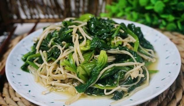 7年。加入菠菜和金针菇,翻炒,加入盐和酱油,翻炒均匀,去除