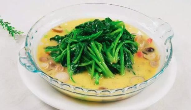 3年,在锅里炒菠菜,加入少许白胡椒和盐,并加入鸡汤炒约1.5分钟