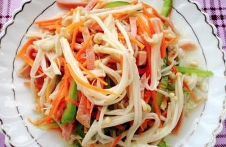 金针菇、青椒、火腿、胡萝卜、食盐、鸡精、芝麻油
