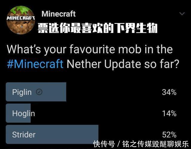 轶事:《我的世界》以1.16的票数支持你最喜欢的下限新生物。目前,脚兽斯特里德以52%的选票领先。投票将在未来持续两天。