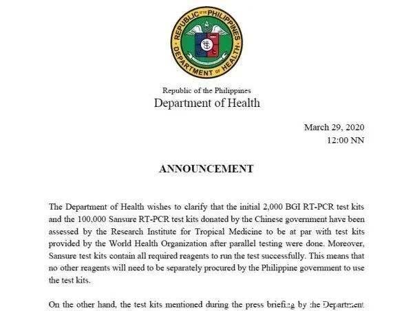 菲律宾卫生部在28日的例行新闻发布会上提到的检测试剂盒是另一个由私人基金会捐赠的试剂盒品牌。在对相关文件进行初步审查后,热带医学研究所认为有必要对其进行后续核查。为了减少这一额外步骤,私人基金会随后的捐赠将使用华大基因和盛翔技术公司生产的试剂盒。菲律宾卫生部为之前评论造成的误解道歉