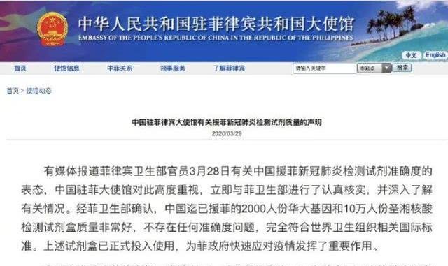 3年10月29日,中国驻菲律宾大使馆发布了《关于菲律宾肺炎克雷斯特检测试剂质量的声明》。声明称,中国驻菲律宾大使馆高度重视媒体报道,菲律宾卫生部官员于3月28日发表声明,对中国用于检测菲律宾凤头肺炎的辅助试剂的准确性表示关注,并立即与菲律宾卫生部进行了认真核实和深入了解。据菲律宾卫生部确认,中国向菲律宾提供的2000份华大基因和100000份盛翔核酸检测试剂盒质量非常好,没有任何准确性问题,完全符合世界卫生组织的相关国际标准。上述工具包已经投入使用,在菲律宾政府对这一流行病的快速反应中发挥了重要作用。