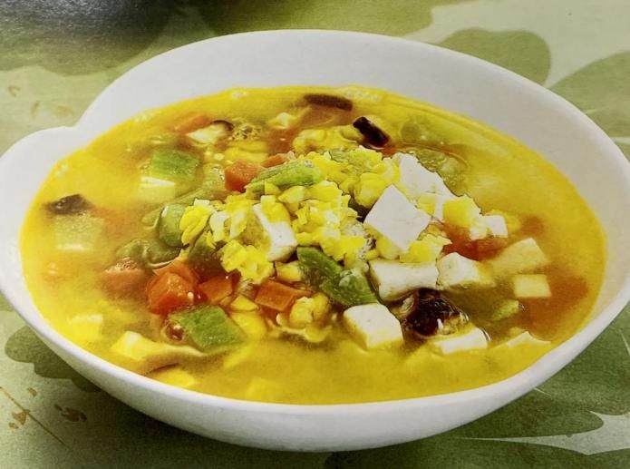 配料:豆腐200克,甜玉米50克,丝瓜1个,胡萝卜各1个,蘑菇、盐、淀粉和芝麻油