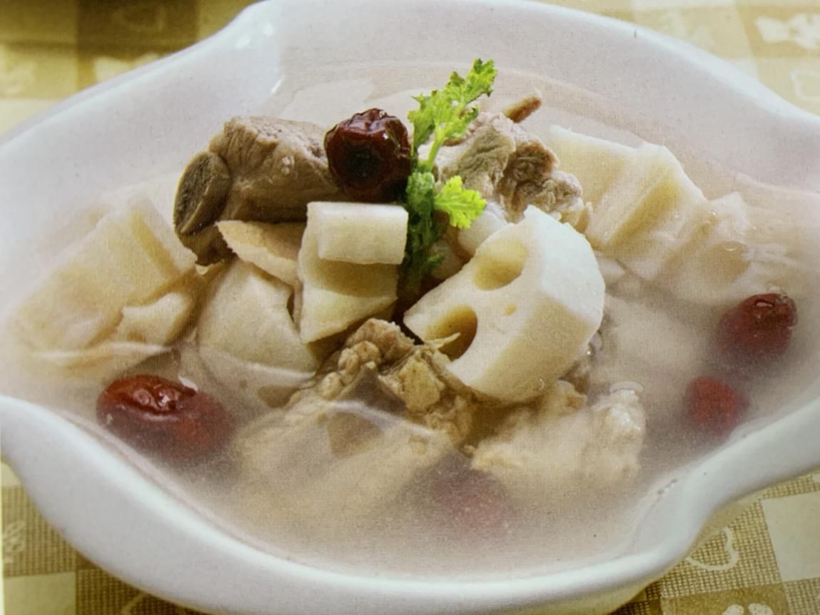 配料:200克排骨、100克莲藕、红枣、大葱、生姜、
