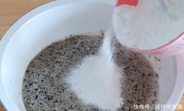 3。将3克酵母和一勺白糖加入到打好的黑豆酱中,搅拌均匀,然后加入少量面粉数次,搅拌