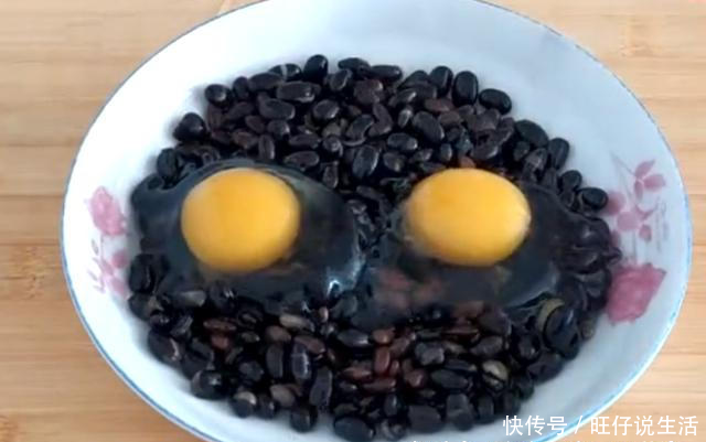 2,倒入两个鸡蛋浸泡美味的黑豆并搅拌均匀,倒入烹饪机中制成黑豆酱