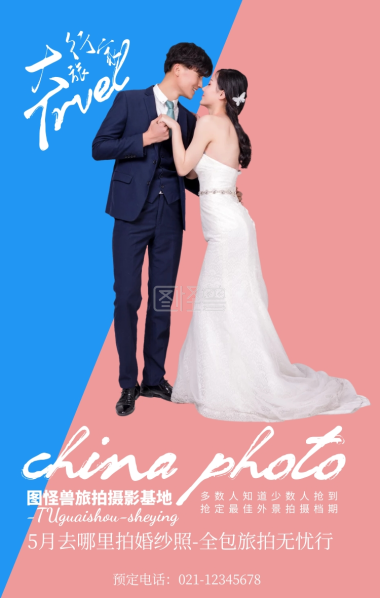 五月婚纱婚礼旅拍定制卡通粉红手机海报