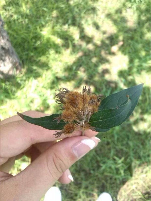 叶子宽宽的,中间有好几个土黄色带毛的球,是一