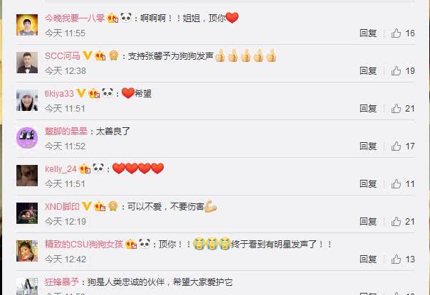 张馨予在微博上替狗狗发声:应给它们应有的生