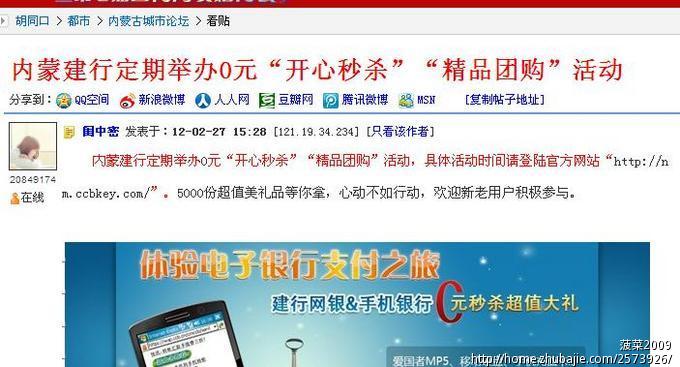 内蒙古建行网银手机开心秒杀活动火爆进行中,