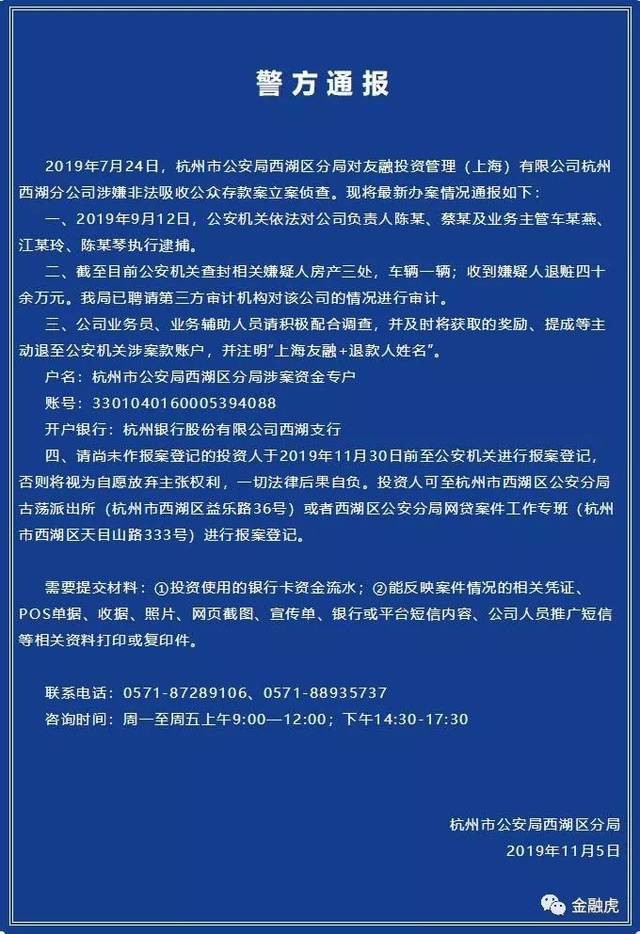 友融财富西湖分公司5人被执行逮捕 实控人半年